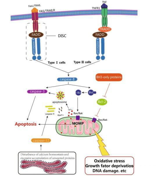 细胞凋亡的发生涉及多个信号通路和分子机制。其中最经典的是线粒体通路和死亡受体通路。线粒体通路主要通过调控线粒体的膜电位和释放线粒体内的细胞色素C来触发细胞凋亡。死亡受体通路主要通过死亡受体和配体之间的结合,激活Caspase家族蛋白酶来诱导细胞凋亡。