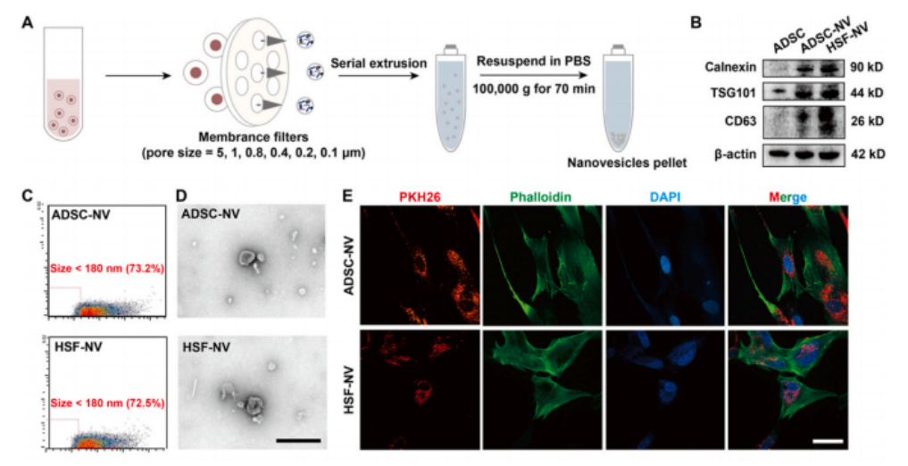 先前有研究表明,CNVs表现出与外泌体相似的形态,并包含超过70%的相同膜蛋白。因此,在本研究中,如图1A所示,作者通过膜上梯度机械挤压和超离心获得纯化的CNVs。此外,我们从图1B的WB鉴定结果可以看到,ADSC-NVs 和HSF-NVs的特异性蛋白表达阳性。然后,我们可以从图1C的透射电镜和粒径检测结果发现,大多数ADSC-NVs和HSF-NVs均由小于110 nm的颗粒组成,其中小于180 nm的颗粒分别占总分数的73.2%和72.5%。此外,我们还可以从图1D观察到,CNVs的结构与外泌体相似,呈脂质膜包围的圆杯状形态。图1E则显示,pkh26标记的CNVs显示红色荧光并与DPCs共孵育。另外,采用phalloidin对DPCs细胞骨架进行绿色荧光染色。这些结果表明,DPCs具有内化ADSC-NVs和HSF-NVs的能力。