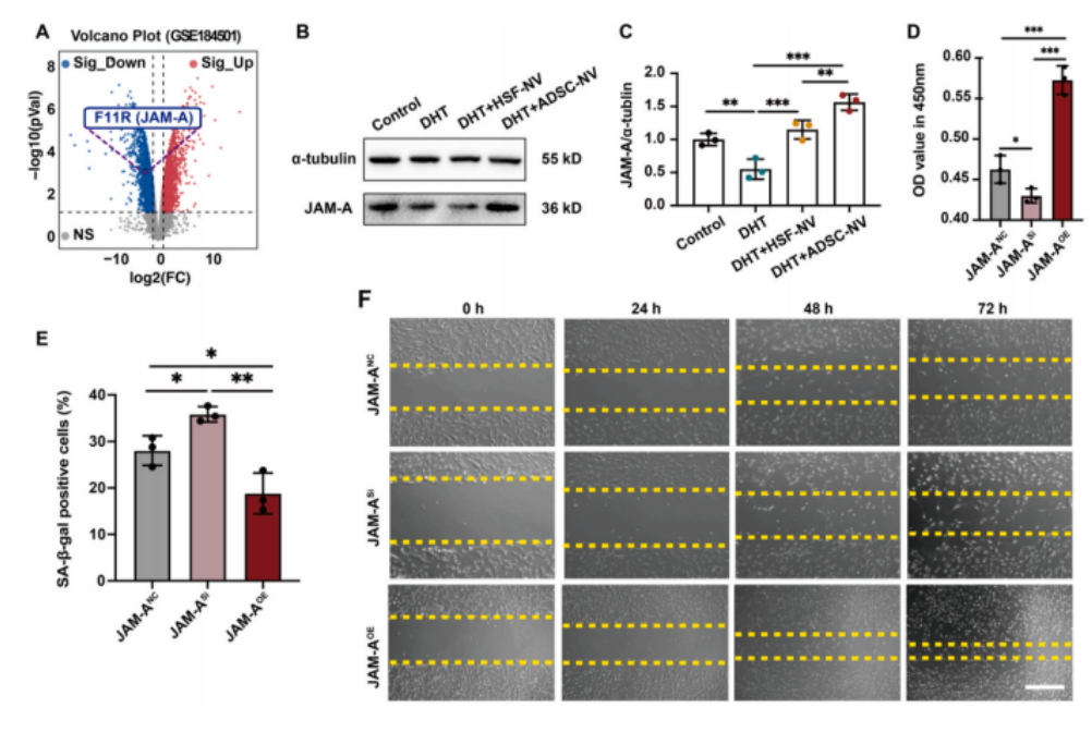 前期的研究表明,JAM-A可以保留斑秃的DPCs功能,刺激HF再生。与本研究的结果一致,我们可以从图3A的DHT损伤的DPC数据集分析中发现JAM-A的表达显著降低。然后通过图2B和2C的WB实验验证了ADSC-NVs可以有效地抵消DHT诱导的JAM-A蛋白下调。此外,图3B和3C的实验结果显示,ADSC-NVs比HSF-NVs能够包裹和递送更多的JAM-A蛋白,以减轻DHT损伤。
